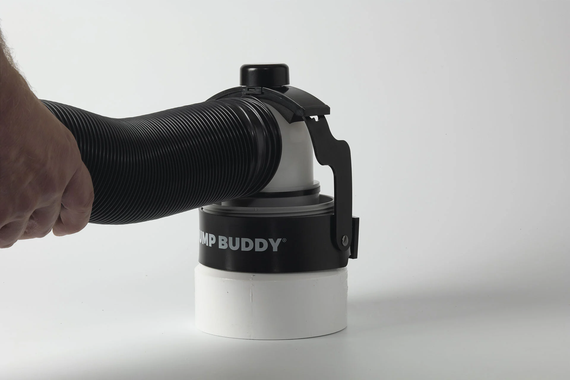 ump Buddy works with all industry standard 90 degree elbows on the market. The hose and 90 degree elbow shown in the pictures are from Camco and can be found on Amazon.